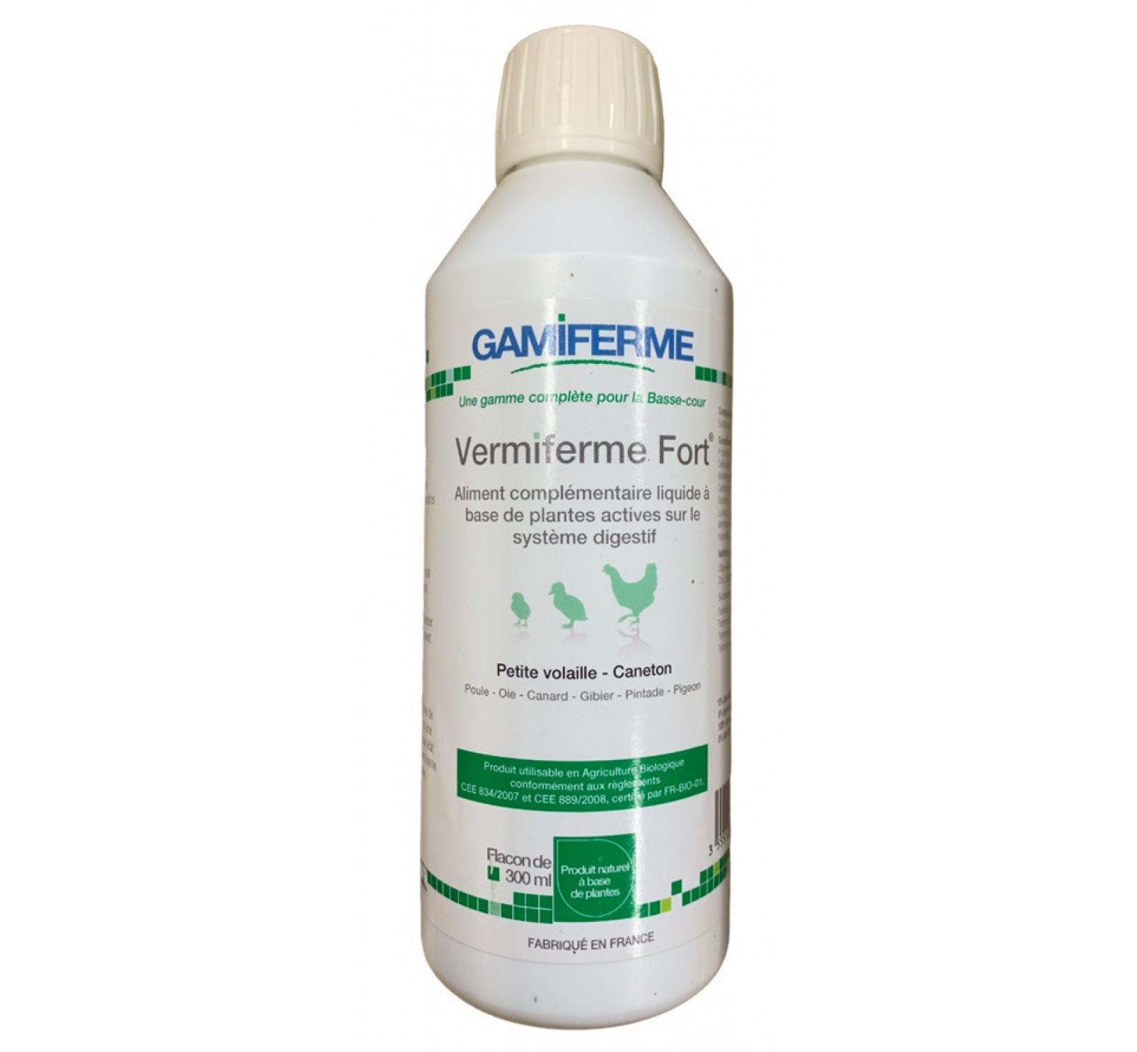 Le Vermiferme fort est un aliment minéral complémentaire permettant de diminuer l'installation de parasites internes, tels que les vers, chez les canards, gibiers, poulets, oies, pintades, dindes, pigeons, petites volailles, canetons, pintadeaux, poussins, lapins, lièvres, etc.