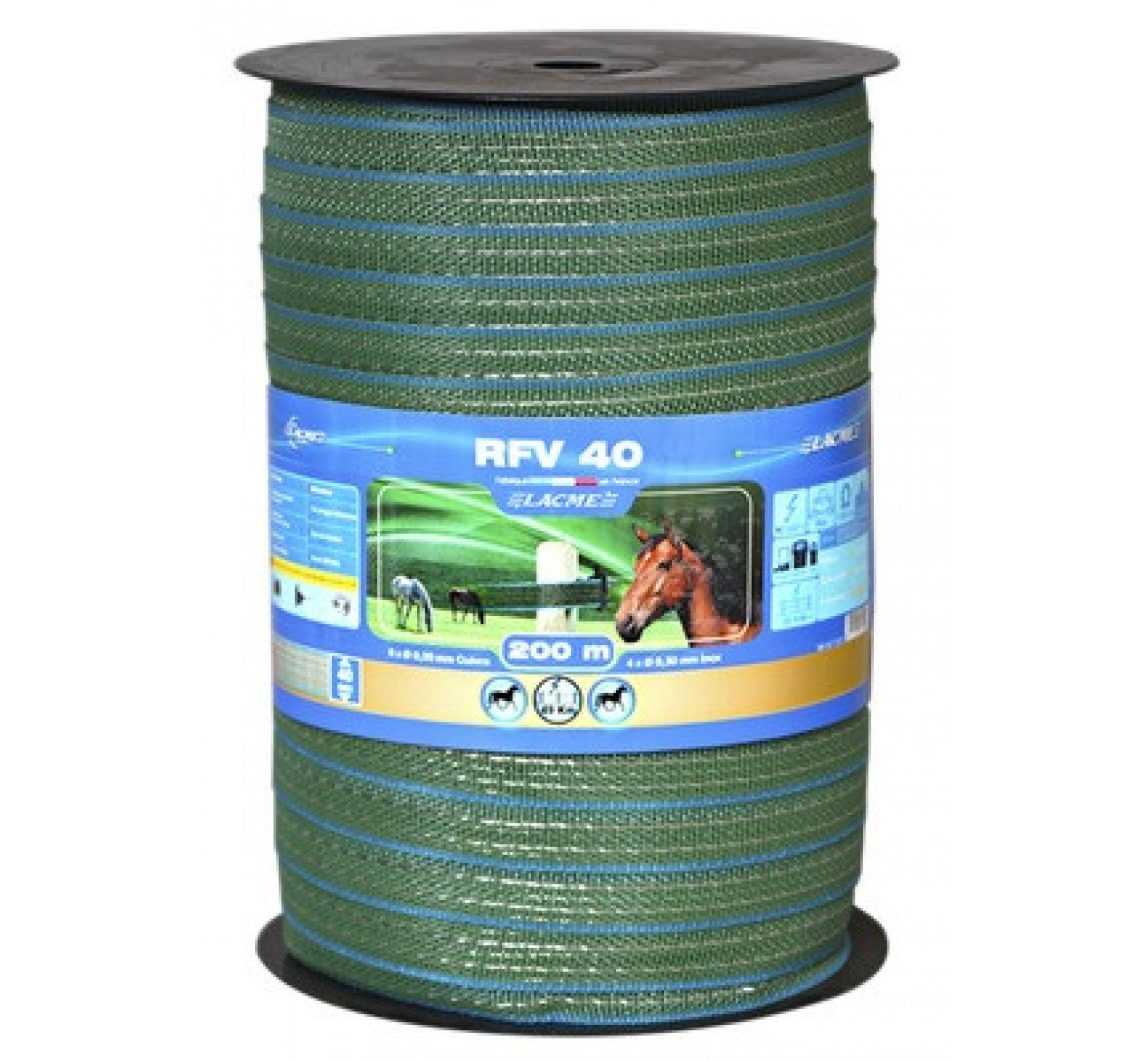 Ruban renforcé 40 mm vert équipé de 4 cuivre Ø 0.30, 6 inox Ø 0.30, soit 10 conducteurs groupés anti-coupure.