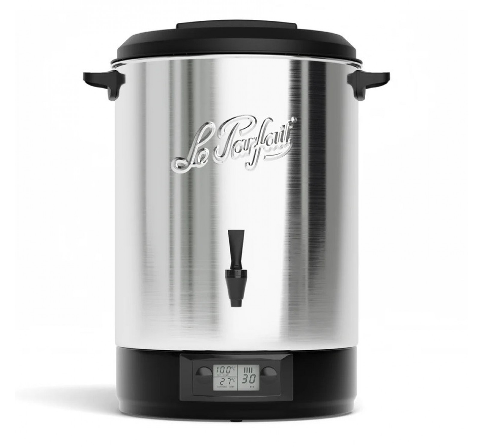 Le stérilisateur électrique automatique Le Parfait® offre une capacité généreuse de 45 litres dans une cuve en inox brillant, pour accueillir 16 bocaux en une seule session. Doté de poignées thermo-isolantes, d'un couvercle en plastique noir et d'un robinet de vidange intégré, il allie sécurité, confort d'utilisation et robustesse.