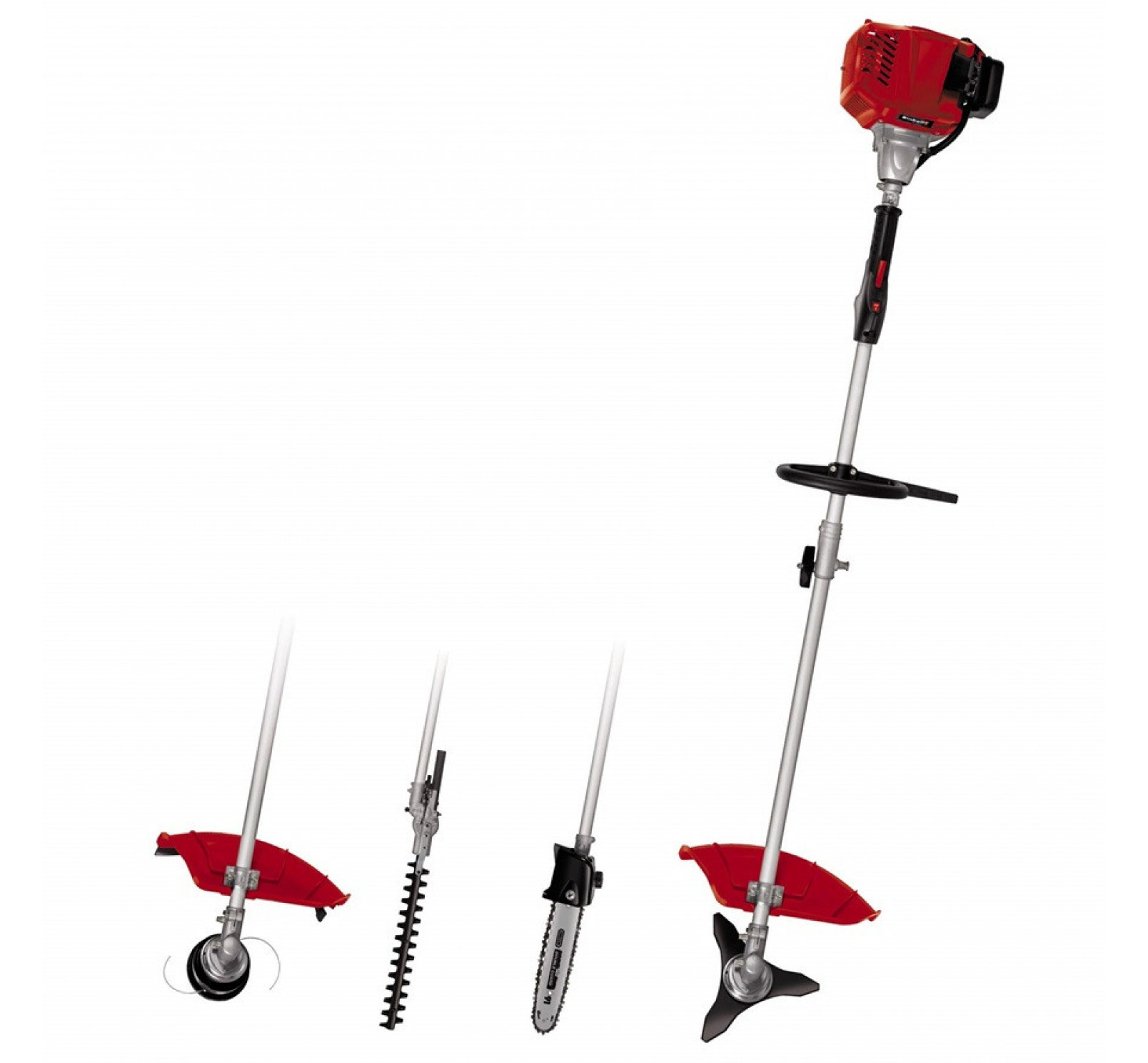 Cet outil multifonctions fonctionne avec un moteur 2 temps haute performance et est équipé dune lame à 3 dents, dune bobine double fil à avance automatique, dun guide-chaîne et dune chaîne de qualité OREGON pour la fonction délagage en hauteur, et de lames taille-haies en acier découpées au laser et affûtées au diamant. La lubrification de la chaîne seffectue automatiquement. Le dispositif taille-haie est inclinable.