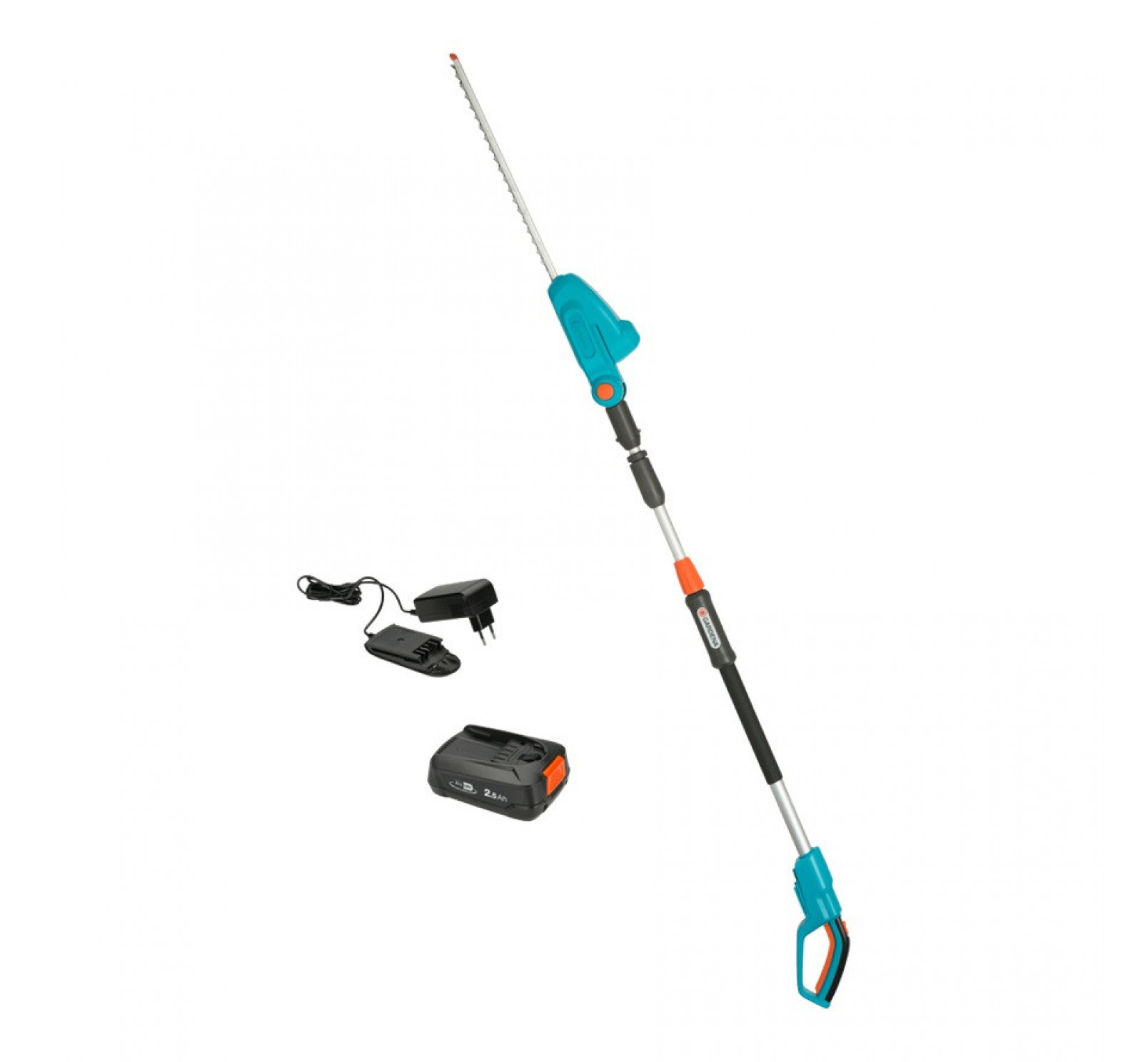 Le taille-haies sur perche à batterie THS 42/18V P4A GARDENA est idéal pour élaguer les haies de grande taille, sans échelle et en toute sécurité depuis le sol. Il est doté d'un manche télescopique dune portée denviron 3 m, dune autonomie maximale de 100 min afin de tailler jusquà 250 m² de haies. Sa tête pivotante permet de tailler le dessus des haies sans effort, de même que les branches proches du sol. Equipé dun protège mains et fonctionne avec une batterie 18 V Li-Ion / 2,5 Ah (fournie).