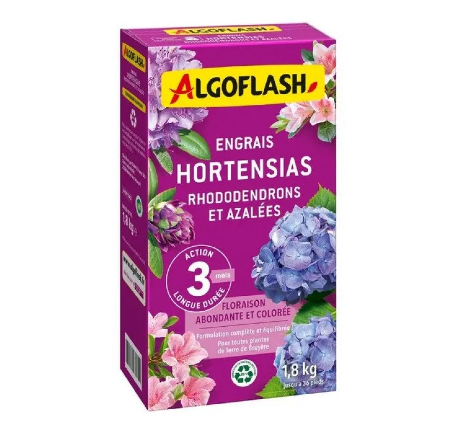 L'Engrais Hortensias et Rhododendrons Algoflash permet une floraison abondante, colorée ainsi qu'une végétation vigoureuse à toutes vos plantes de bruyère. Il convient à toutes les plantes craignant le calcaire (azalées, magnolias, camélias, bruyères, érables du Japon, etc.).